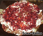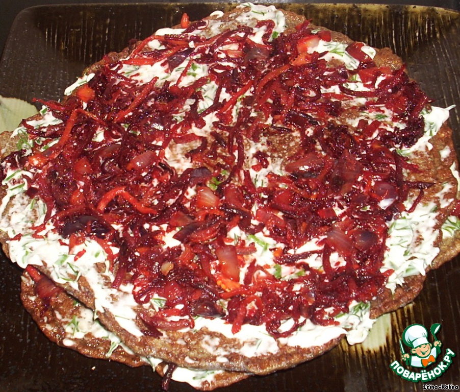 На горячие печеночные блинчики намазывать слой чесночного майонеза и выкладывать слой бордовой овощной смеси.