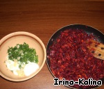 Майонез смешать с оставшимся давленным чесноком. Мелко накрошить укроп. Лук с морковью и свеклой обжарить на сковороде до полной готовности.