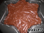 Всыпать муку с орехами и измельченным черносливом, какао и быстро перемешать, выложить в форму для выпечки.