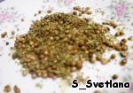 Одну головку чеснока очистили, а зубчики через чеснокодавилку и растерли со 100гр крупной соли (обязательно крупной). Добавили молотый кориандр (у меня был свой с дачи) и свежий кориандр (кинзу), затем молотый красный перец, майоран и чабер (черный молотый перец автор не рекомендует).