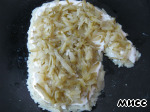 Сваренный в "мундирах" картофель очищаем, натираем на крупной тёрке и на блюде выкладываем форму "варежки".