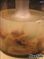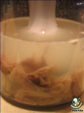 • Курицу разделываем. Мясо с 1 стаканом бульона перемалываем блендером.