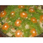 Помидоры помыть, обсушить, разрезать пополам и удалить семенную часть. Она придет водянистость, а наш салат и так достаточно сочный. Нарезать мясистую часть помидор соломкой. Часть перемешать с салатом, а оставшиеся дольки использовать для украшения.