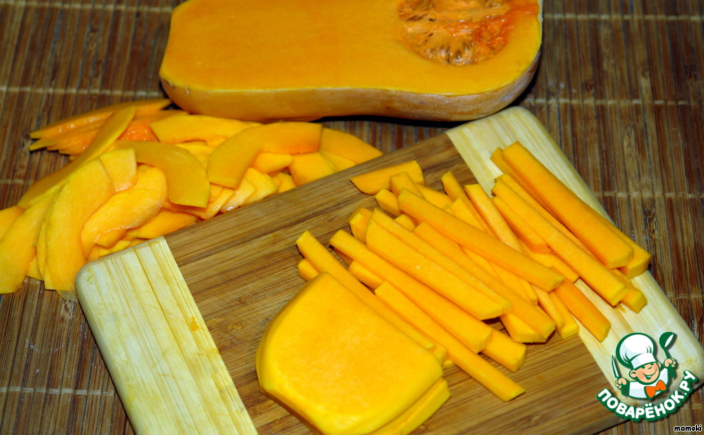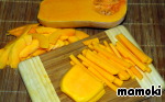 С тыквы снять корку, удалить семена и мягкие волокна, нарезать ломтиками. У меня не получилось всю тыкву нарезать ломтиками в силу ее ботанических особенностей, часть я нарезала соломкой.