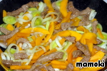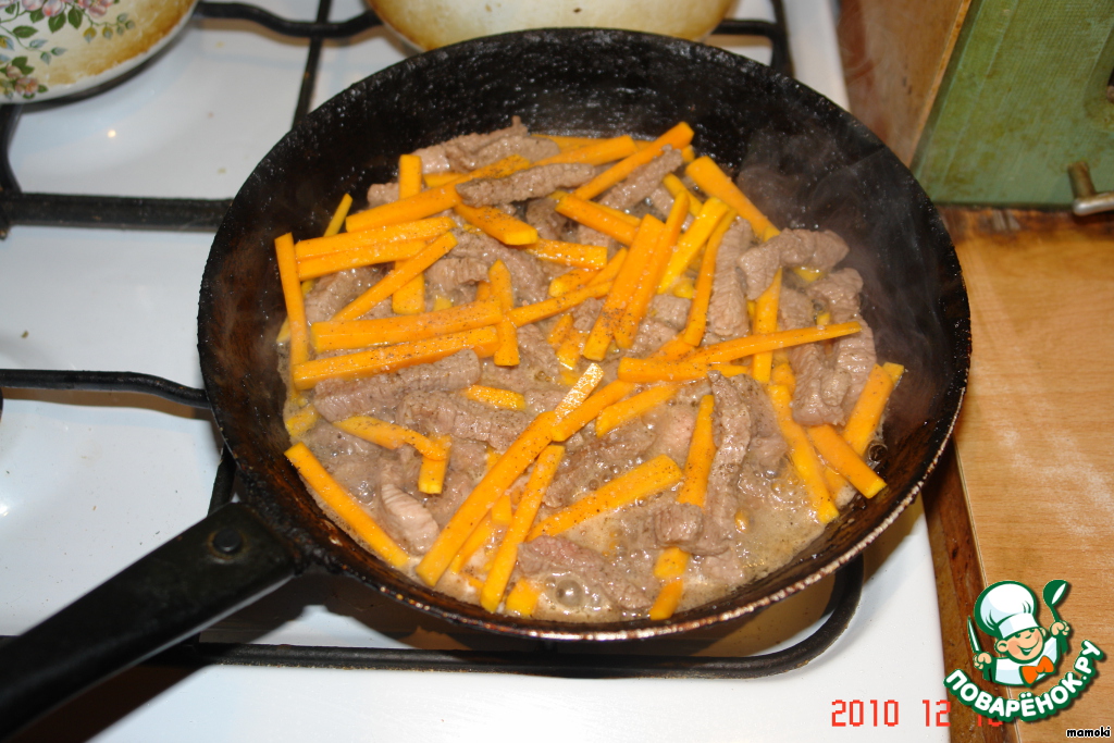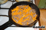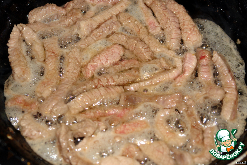 На сковороде раскалить растительное масло и обжарить в нем мясо. Автор рекомендует делать это в течении 3-х минут. Я бы посоветовала именно этот этап удлинить до 5-7 минут. Посолить и поперчить мясо.