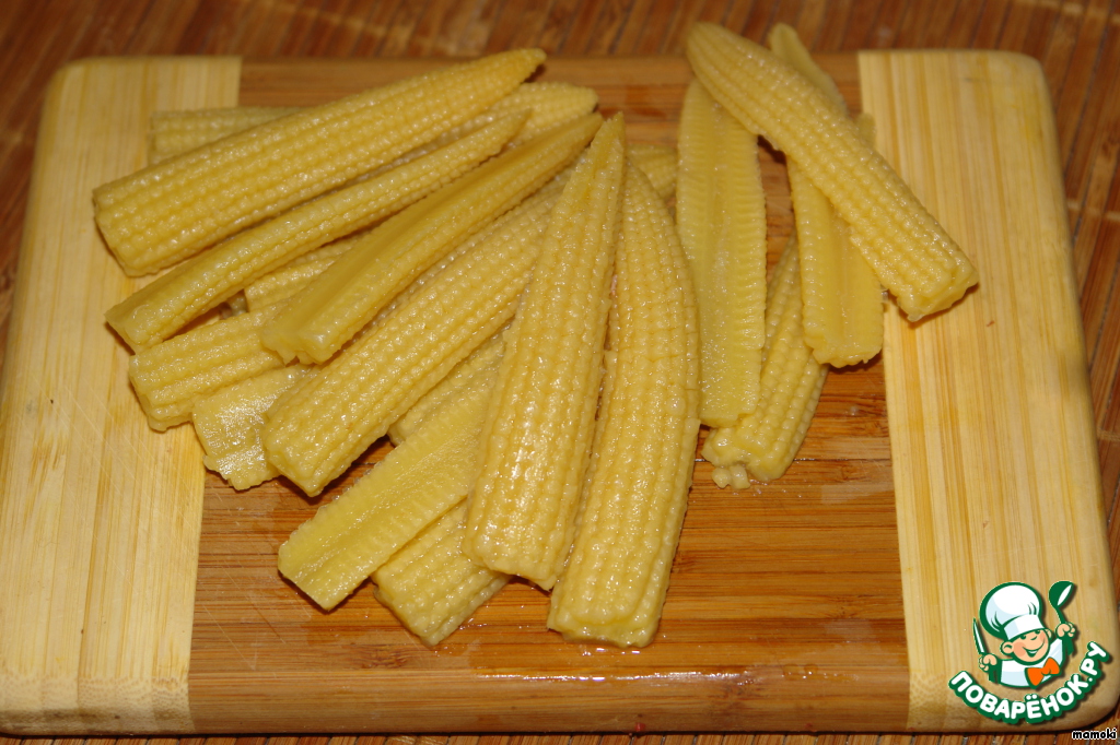 - Кукуруза (маринованная, в мини-початках) — 150 г
