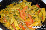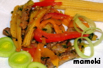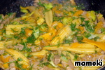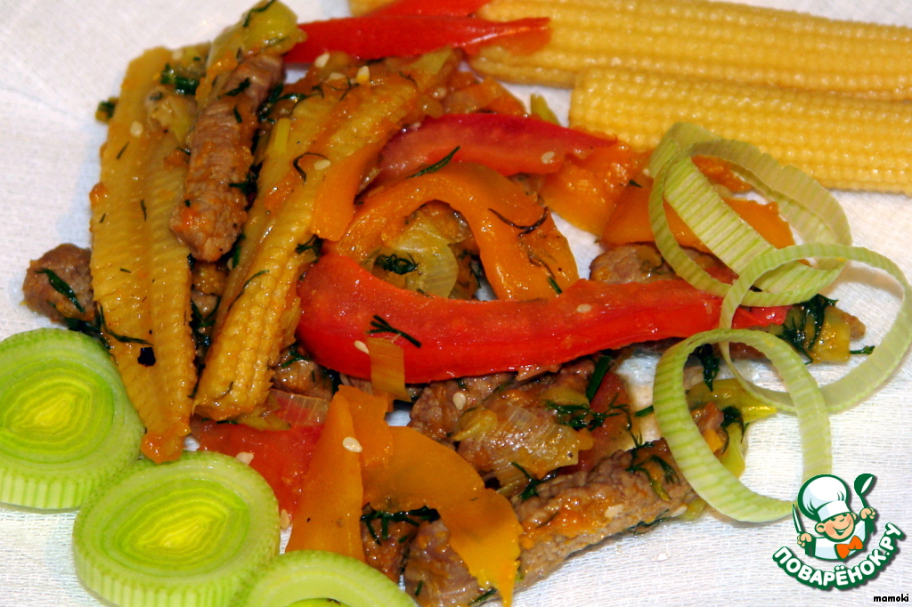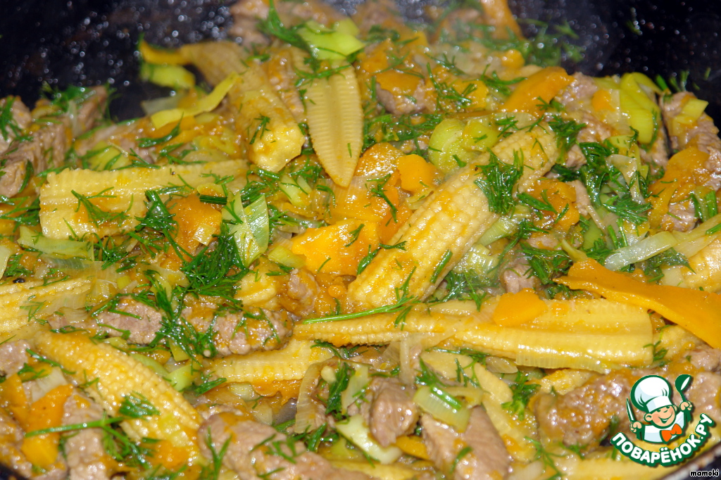 Кукурузные початки достать из маринада, обсушить и нарезать вдоль пополам. Так же выложить в сковороду. Помешивая, обжаривать мясо и овощи в течении 5 минут. А вот этот этап я сократила до 3-х минут. Достаточно.