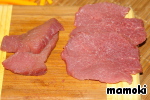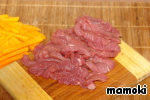 Нарезать мясо соломкой поперек волокон.