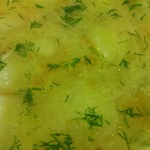 Когда бульон готов, достаем курицу, режем на небольшие кусочки. Кладем обратно в бульон. Туда же кладем мелко порезанный картофель. Варим до готовности.