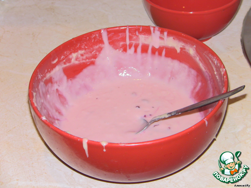 Теперь подробнее. Смешиваем муку, сметану и сахар до однородной массы, без комочков. Добавляем чайную ложку соды, гашеную уксусом. По консистенции должно получиться, как жидкая сметана. Делим тесто на 3 равные части. Каждую из них можно разнообразить. Я, обычно, в одну кладу 2 столовые ложки какао, в другую - столовую ложку меда, в третью - ягоды. Но можно коржи выпекать и так. -