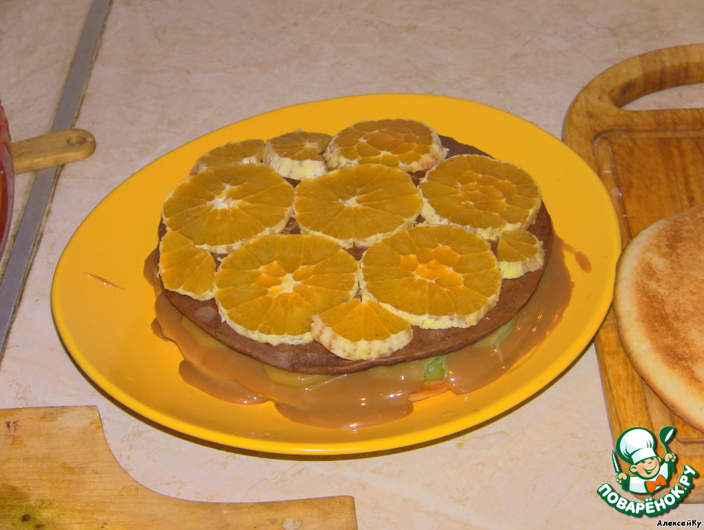 Между коржами можно слоями укладывать кислые ягоды и фрукты: малину, клубнику, киви, апельсины.