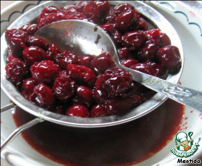 • Готовим соус: вишню кладем на сковородку, в которой жарилось мясо, приправляем солью, перцем, добавляем мед, горчицу и винный уксус, ставим на огонь и готовим, помешивая минут 10, должно выделиться много сока, а вишня стать мягкой.