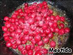 Готовим соус: вишню кладем на сковородку, в которой жарилось мясо, приправляем солью, перцем, добавляем мед, горчицу и винный уксус, ставим на огонь и готовим, помешивая минут 10, должно выделиться много сока, а вишня стать мягкой.