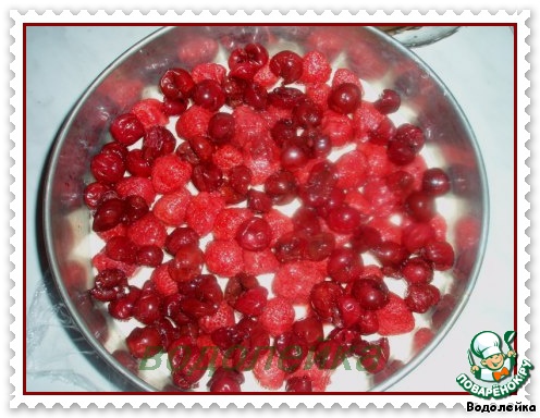 Достаем из холодильника нашу форму и сверху выкладываем ягоды (или фрукты). У меня вишня была замороженная. Я ее разморозила и смешала с сахаром, т.к вишня-то кислая.