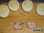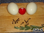 Для этого понадобятся 2 вареных яйца, 1 редиска, черный перец горошком, гвоздика и листики розмарина. -