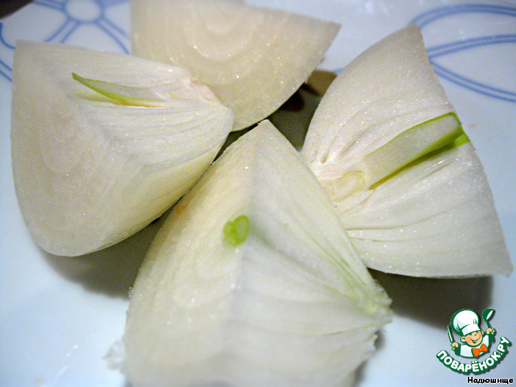 Добавляем лук, просто разделенный на четвертинки. И варим все овощи до мягкости.