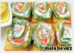 Отступив по 2 см от каждого края, выложить ровным слоем творожный сыр, затем сежую зелень. Сверху по всей поверхности выложить семгу. Аккуратно свернуть в тугой рулет и перенести его на прозрачную пленку.