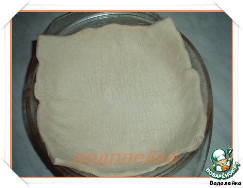 Теперь берем форму. У меня огнеупорная кастрюлька (объемом 1.5 литра). Смазываем маслом и распределяем по форме кусок слоеного теста так, чтобы были бортики.