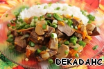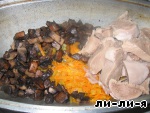 Сложить в кастрюлю язык, грибы и морковь с луком.