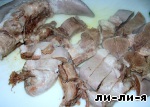 Язык отварить до готовности (я варила 45 минут в скороварке). Сразу же вытащить язык из бульона. Опустить его в холодную воду и снять кожу. Не солить при варке! Бульон нам не пригодится - вылить.