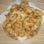 В сковородке разогреть масло для фритюра. С помощью вилки или щипцов окунать кольца лука в тесто и бросать на сковородку. Жарить лучше порциями, чтобы на сковородке не было тесно. Как только появится золотисто-коричневый цвет (через 2-3 минуты) вынуть кольца шумовкой и положить следующие.