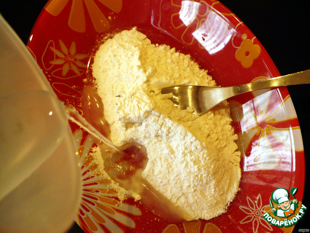 Муку смешать с крахмалом, 1 ч. л. соли и разрыхлителем (на кончике ножа) и постепенно влить холодную воду, чтобы получилось тесто по консистенции, как густая сметана.