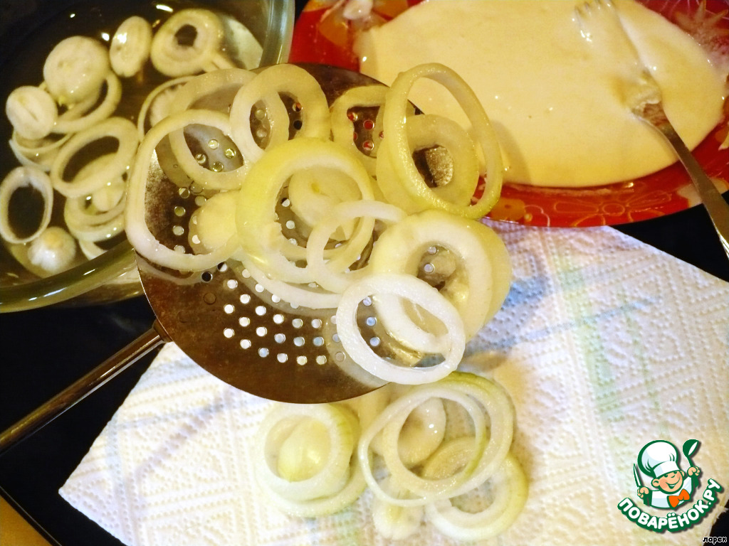 Лук вынуть из воды, промокнуть кольца бумажным полотенцем. Нужно, чтобы они были сухими, иначе корочки не получится, мука размякнет.