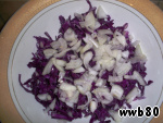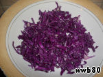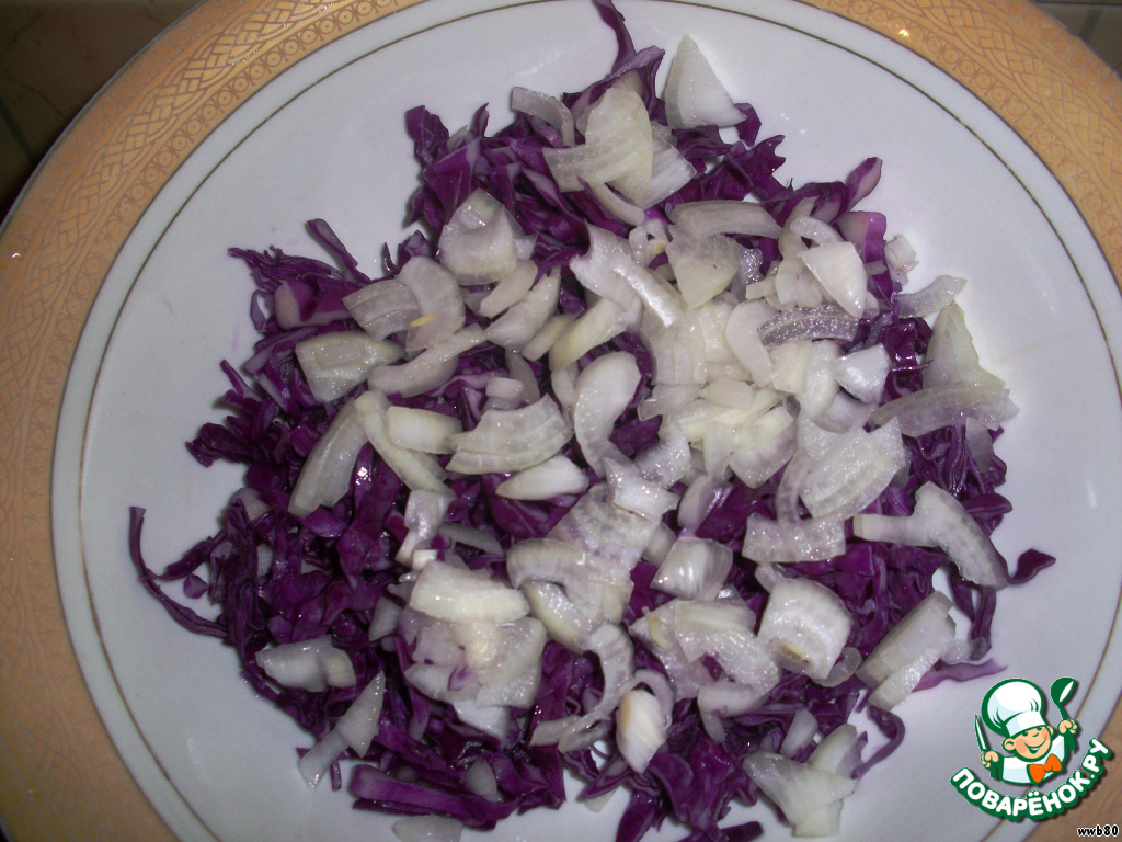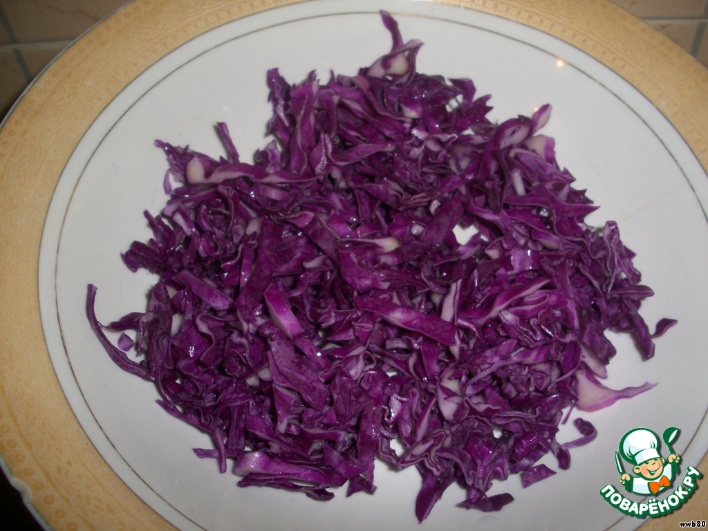 Краснокoчанную капусту тонко нарезать.