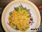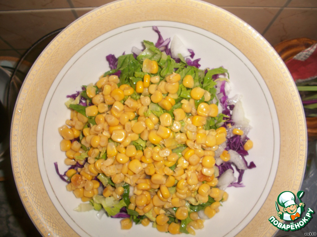 и консервированную кукурузу. Заправить маслом, солью и соком лимона. Перемешать.