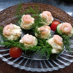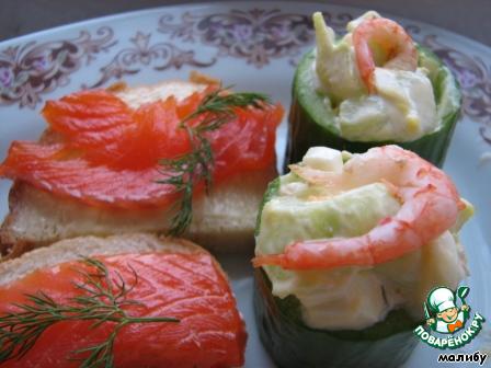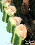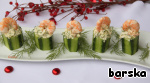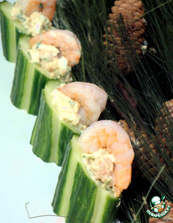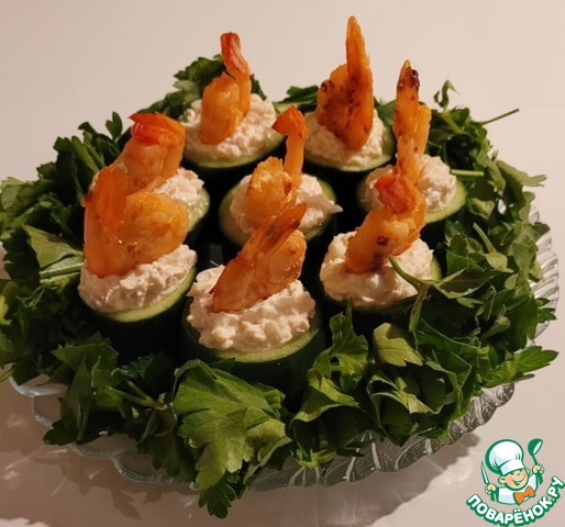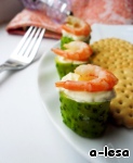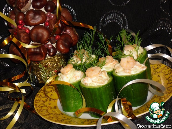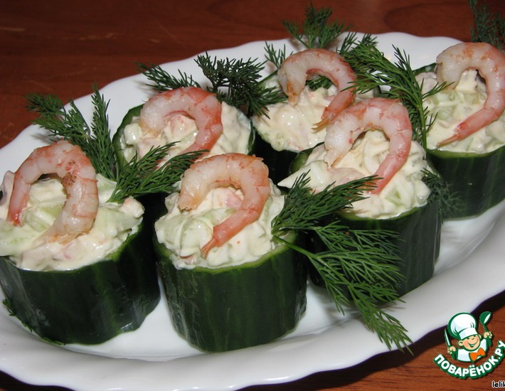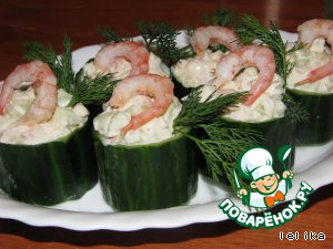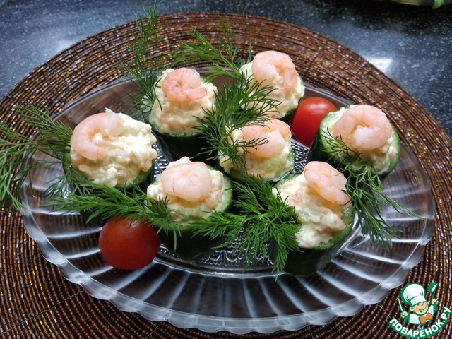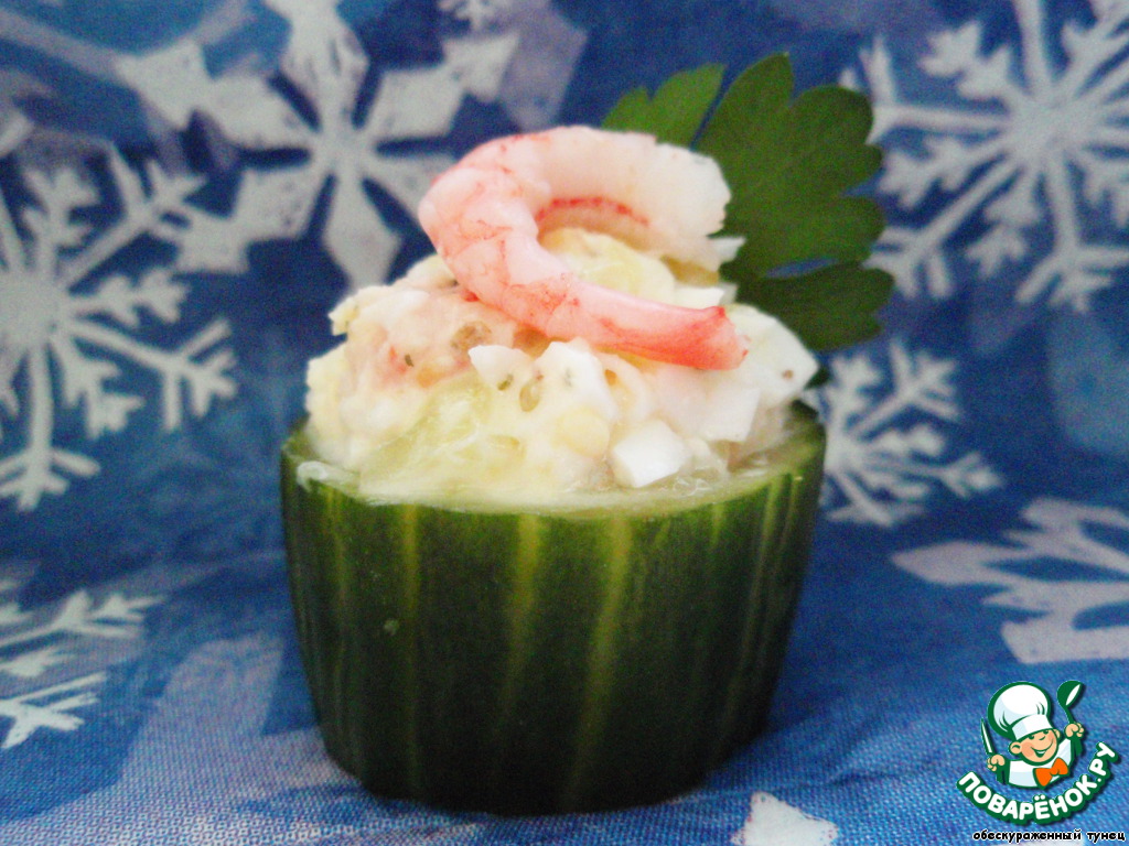 Полученным салатом наполняем наши огуречные стаканчики и украшаeм креветкой и зеленью!!