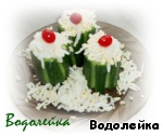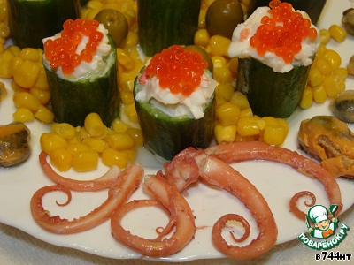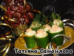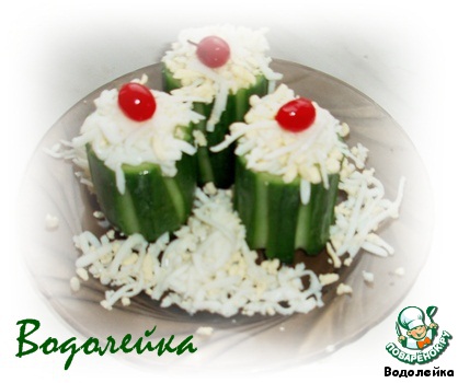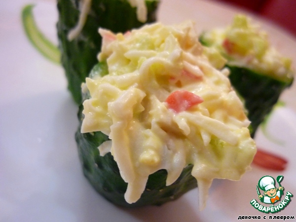 Огурец нарезать на сегменты (у меня 3 см). Сделать стаканчики, аккуратно вычистив мякоть, чтобы не повредить дно.