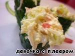 Смешать креветки, огурец, яйцо. Заправить майонезом.