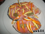 Рыбу посыпать сахаром, солью. Равномерно выложить цедру лимона и поломанный на части лавровый лист.