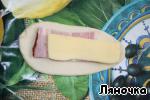На тесто положить ветчину или любое мясо (я использовала шейку), сверху накрыть ломтиком сыра. |