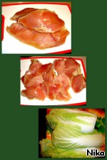 Очень похоже на голубцы. Но не голубцы. Капуста не белокочанная, а пекинская. Не фарш, как обычно в голубцах, а куриное филе.