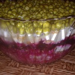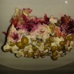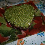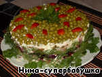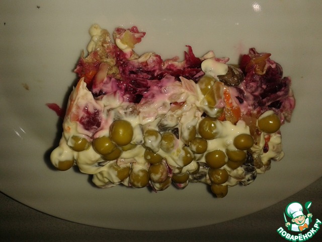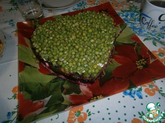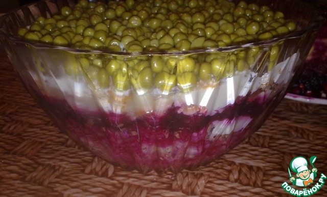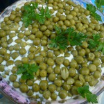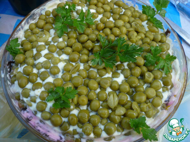 Сверху выложить зеленый горошек, естественно без рассола. В таком виде убрать салат в холодильник на полчаса-час, чтобы он окреп и пропитался.