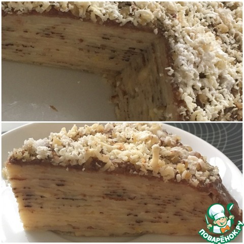 Испечь тонкие блинчики. У меня вышло 15 шт., тортик получился невысокий.