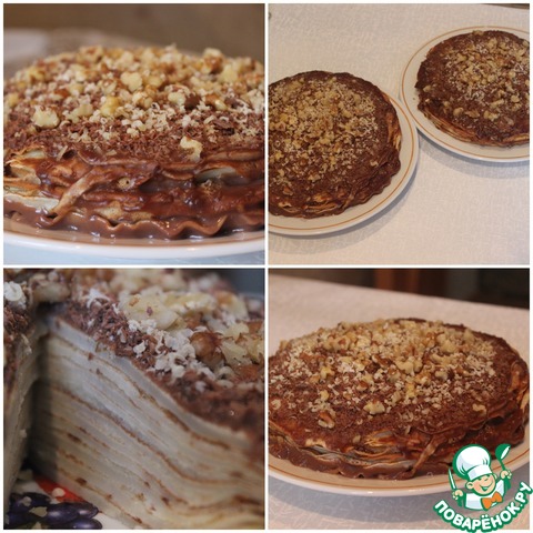 "Креп" по-французски значит блин, "Крепвиль" - французский блинный торт. Наткнулась в интернете на восторженные отзывы об этом торте, картинка была просто потрясающая. Если вы живете в Питере, настоящий "Крепвиль" всегда можно купить в "Ашане" или "Перекрестке". Мы, к сожалению, живем в Архангельске. У нас "Крепвиль" не продают, а попробовать очень хотелось. Долго рылась в интернете и поняла, что, как такового, рецепта "Крепвиля" нет, а нашла вот это: "Получив в руки этот кулинарный рецепт, вы, конечно же, не научитесь готовить торт Крепвиль французской кухни именно таким, каким его продают в магазинах. Но что-то очень похожее получится обязательно. Тем более, что эта еда очень вкусная и относится к разряду «скоростная готовка». " Ничего конкретного, только общие слова. Предлагалось готовые блинчики прослоить кремом из сгущенки с маслом или заварным кремом. Я решила пойти трудным путем.