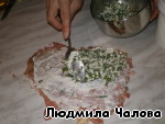 Нарезанную зелень смешать с сыром, чесноком и сметаной. Добавить соль, перец. Полученную смесь выложить на мясо. Мясо свернуть рулетом.