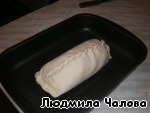 Сверху положить мясной рулет, края защипнуть. Выпекать в духовке при температуре 140 град. 30 минут.