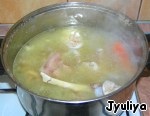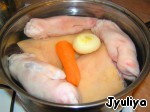 Залить водой, добавить морковь и луковицу. Посолить. Варить 4 часа. И тут я подумала: - "Что будет бульон пропадать? Сделаю я ещё и холодец". И добавила сюда же куриные окорочка.