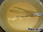 Ставим сковороду на огонь, пусть греется. Тем временем готовим кляр из яиц и муки. Чтобы в кляре не было комков, я сначала 2 яйца смешиваю с мукой и растираю венчиком, получается довольно густое тесто без комочков, а потом "разбавляю" оставшимися яйцами. Немножко подсолить.