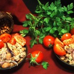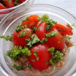Смешать фасоль, филе тунца, петрушку и замаринованный лук вместе с заправкой. Сервировать и украсить помидорами и веточками петрушки. |