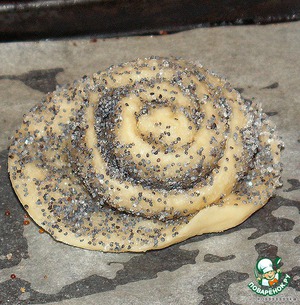 5. Раскатываем всю отведенную на них порцию теста в прямоугольник, посыпаем смесью мака или корицы с сахаром, сворачиваем в рулет. Рулет разрезаем острым ножом.