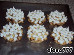 Пирожные осторожно вынуть из формочек, поставить их на противень, выдавить сверху пирамидки крем-безе из кондитерского мешка или пакета. Поставить в духовку на 5 минут, чтобы слегка "подзолотить" кончики (да и для термической обработки белкового крема)