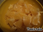 С мякоти апельсинов снять белую плёнку и разобрать апельсин на дольки.