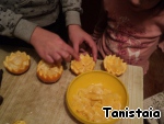 Круговым движением ложки вынуть из половинок апельсинов мякоть, чтобы получились "корзиночки".