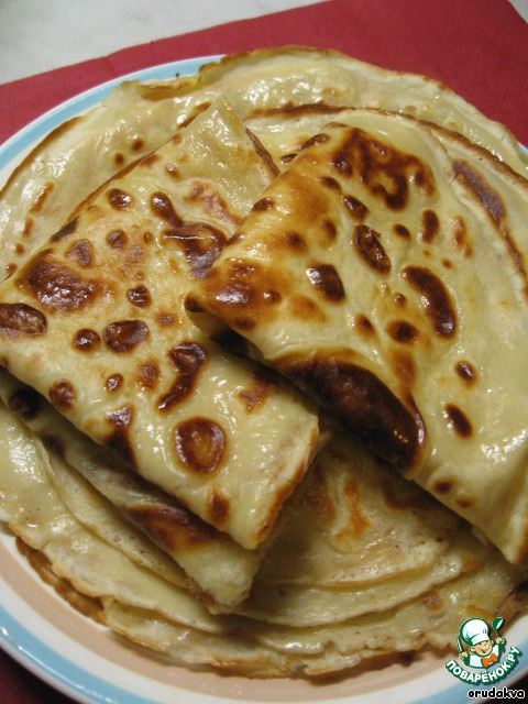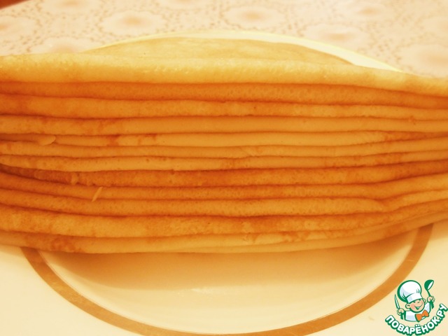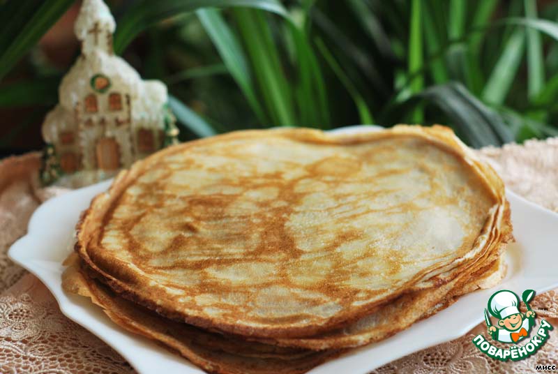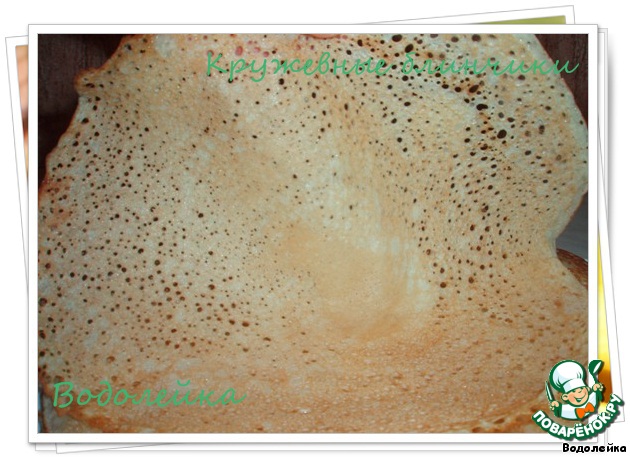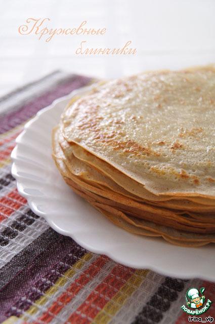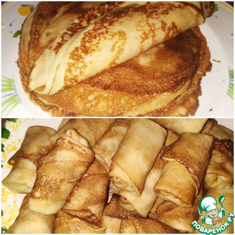 Этот рецепт я, наверно, искала всю свою жизнь. Блины жарила не часто, т. к. не могла найти рецепт идеальных кружевных, тонюсеньких блинчиков. Как-то к нам пришла наша родственница с целым блюдом таких блинчиков, начинка была из капусты с яйцом, конечно я долгое время не решалась спросить рецепт, т. к. она - дама своенравная и только недавно его все-таки заполучила. Конечно, вначале была настроена скептически, думала, что всех секретов она все-равно не расскажет, но была приятно удивлена, когда они у меня получились именно такие, как у нее. Кстати, она - повар в детском саду, итак делюсь самым сокровенным...