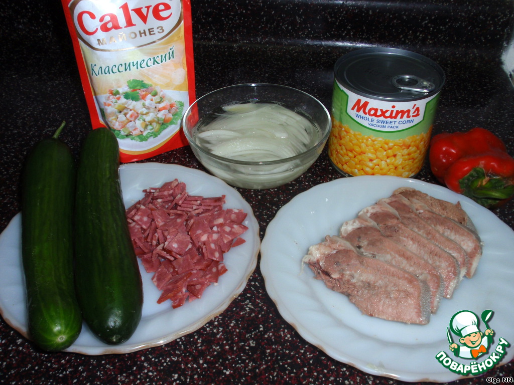 Язык, колбасу, овощи порежем, яйца потрем на терке. Один белок оставим для украшения.