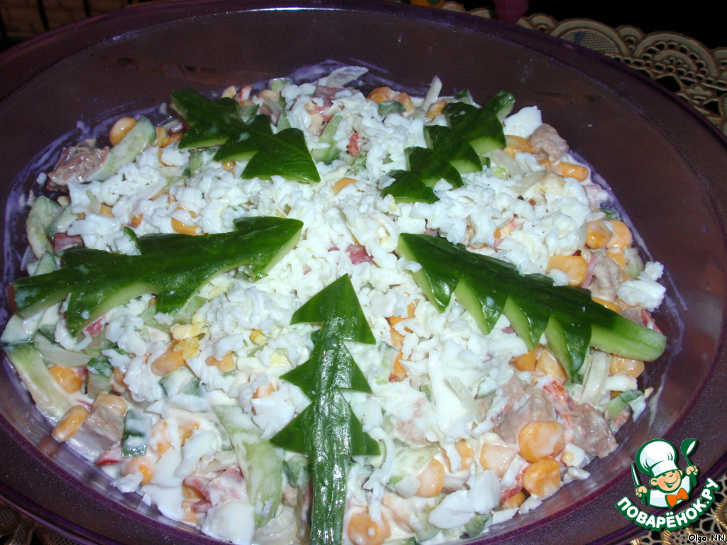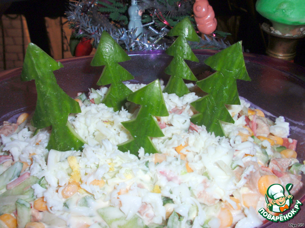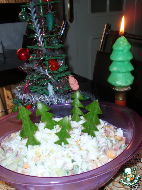 Сверху уже заправленный салат припорошим снежком, т. е. потрем оставленный белок (можно было и два белка оставить) и кладем заготовленные ёлочки...